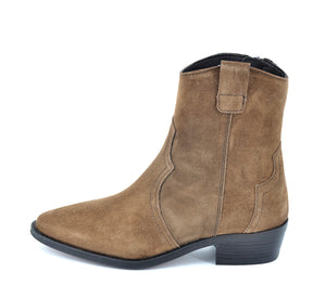 Botín cowboy en serraje cuero. Detalle de pespunte en el corte. Elásticos laterales. Tirador lateral. Acabado en punta. Cierre mediante cremallera.