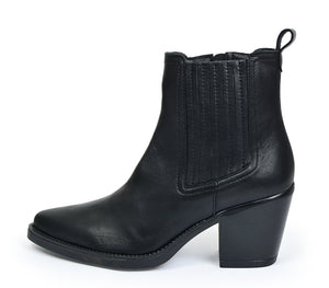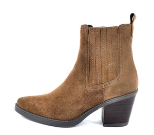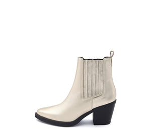 Botín cowboy en piel platino. Detalle de pespunte en el corte. Elásticos laterales. Tirador trasero. Acabado en punta. Cierre mediante cremallera.