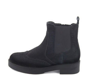 Botín en serraje gris. Calce fácil mediante elástico lateral y cremallera interior. Tirador trasero. Tacón bajo de bloque. Acabado en punta redonda. Detalles de picados en el corte.