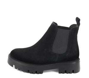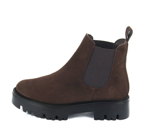 Botín chelsea serraje marrón. Calce fácil mediante laterales elásticos. Tirador trasero. Tacón bajo de sierra. Acabado en punta redonda. Piso extralight.