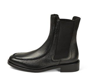 Botín  chelsea en piel negra. Calce fácil mediante laterales elásticos. Tacón bajo en bloque. Acabado en punta cuadrada.